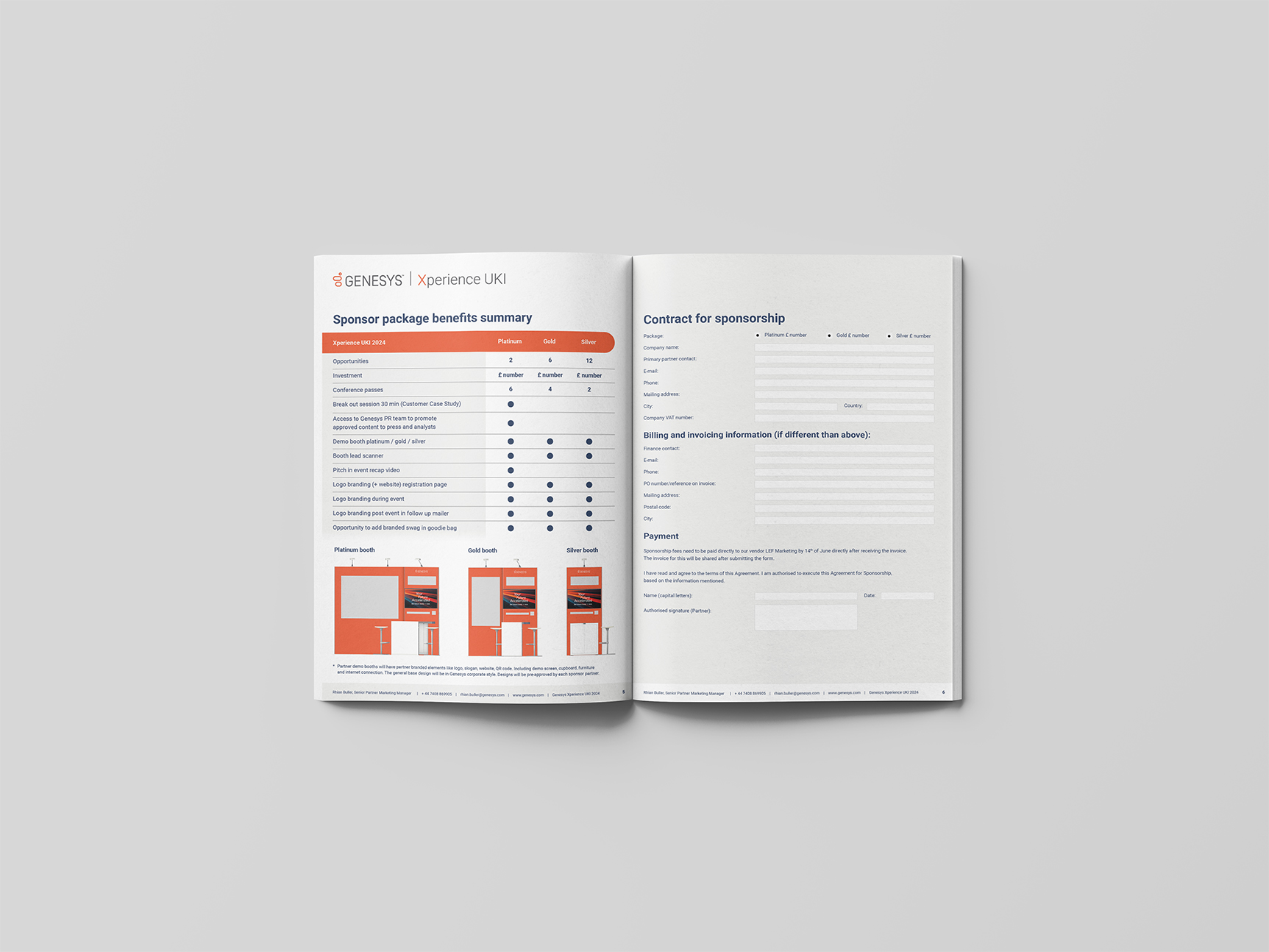 Voor Xperience Amsterdam 2024 van Genesys mochten we de volledige eventbranding verzorgen en dat tot in de kleinste details. Voorafgaand aan het event hebben we de sponsorshipflyer mogen verzorgen. Deze sponsorship flyer is speciaal ontworpen voor potentiële partners en biedt in één oogopslag inzicht in de verschillende sponsorpakketten en bijbehorende voordelen. Veel informatie, maar dan beknopt en overzichtelijk gepresenteerd. Van zichtbaarheid op locatie tot digitale exposure: elke package is helder uitgewerkt zodat geïnteresseerde partijen snel en weloverwogen kunnen beslissen welke vorm van deelname het beste bij hen past. Een krachtige tool in het wervingsproces, met precies de juiste balans tussen inhoud en design.